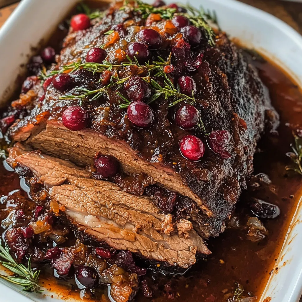 • Carefully remove the pot from the oven. Transfer the brisket to a cutting board and let it rest for 10-15 minutes. Meanwhile, you can skim any excess fat from the surface of the sauce. Slice the brisket against the grain, serve it with the rich cranberry pan sauce spooned over the top, and garnish with fresh thyme.