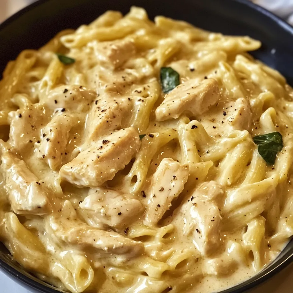• Add the cooked pasta and chicken back to the skillet with the sauce. Toss to coat, adding a splash of reserved pasta water if needed to thin the sauce. Adjust seasoning to taste.
