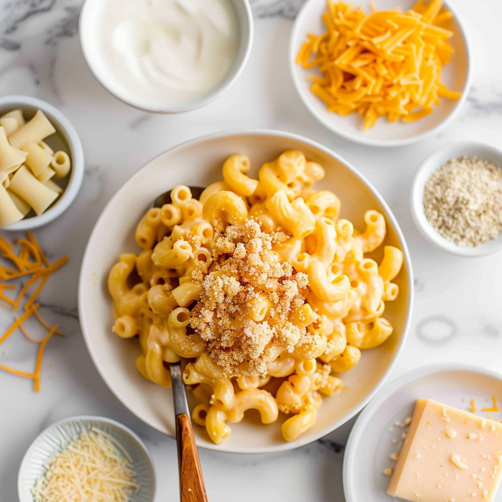 The cheese combination can be customized (e.g., add Gruyère or Gouda for extra depth). If baking, ensure breadcrumbs are gluten-free. Leftovers keep in an airtight container for 3-4 days.