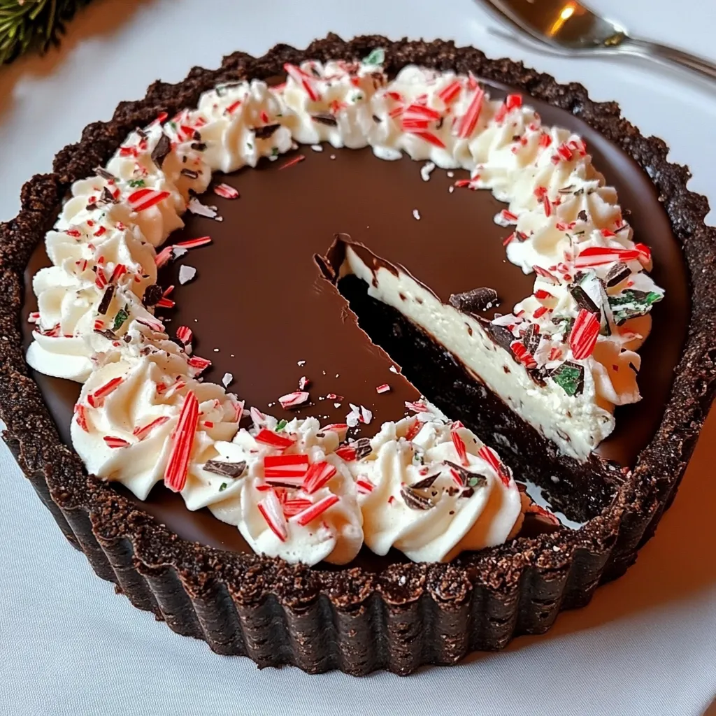 An elegant and easy no-bake Dark Chocolate Peppermint Mousse Tart. A perfect festive dessert with a rich chocolate crust and a light, airy peppermint mousse filling.