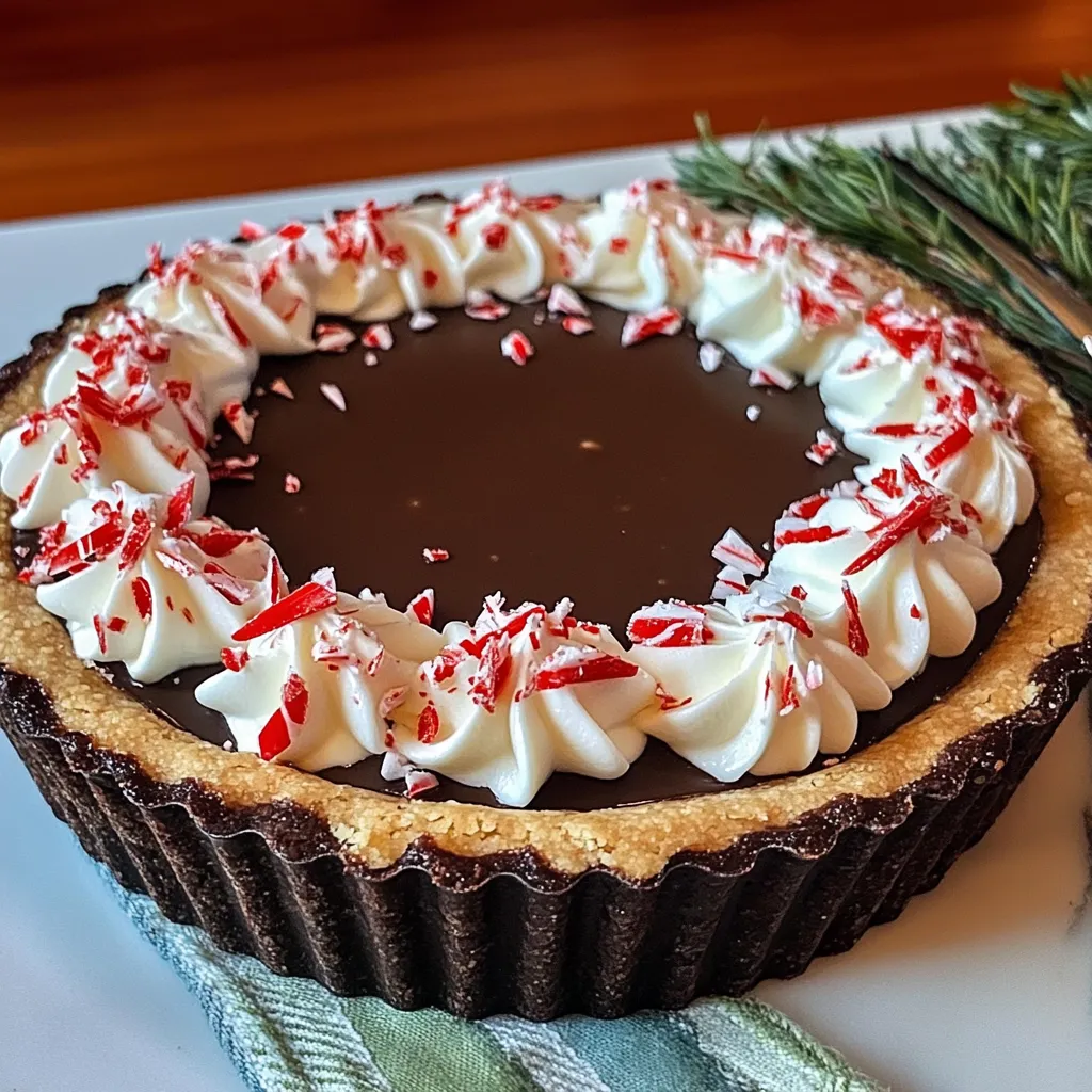 • Before serving, whip ½ cup cold heavy cream with 1 tbsp powdered sugar. Pipe or dollop onto the tart and garnish with crushed candy canes and chocolate shavings.