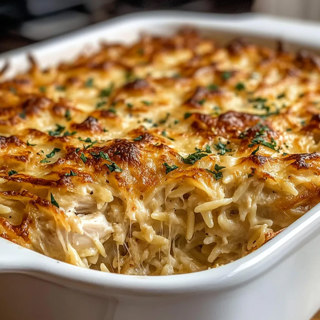 A hearty, one-dish meal featuring the deep, savory flavor of French onion soup with tender chicken and comforting orzo pasta, topped with gooey cheese and crispy onions.