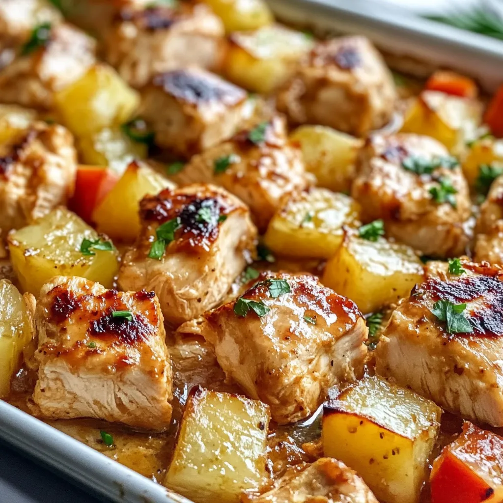 A quick and easy one-pan meal featuring juicy chicken, sweet pineapple, and colorful bell peppers roasted in a sweet and savory Hawaiian sauce. Perfect for a delicious weeknight dinner with minimal cleanup.