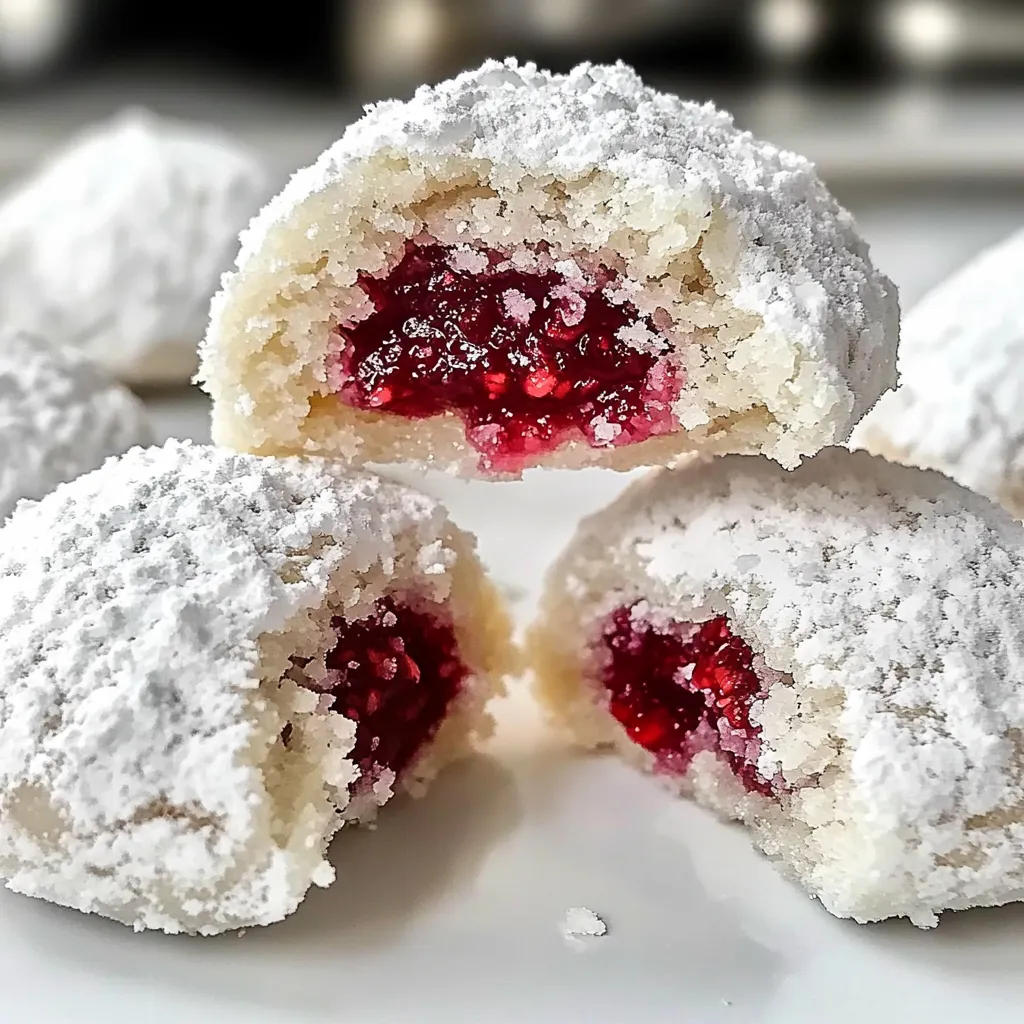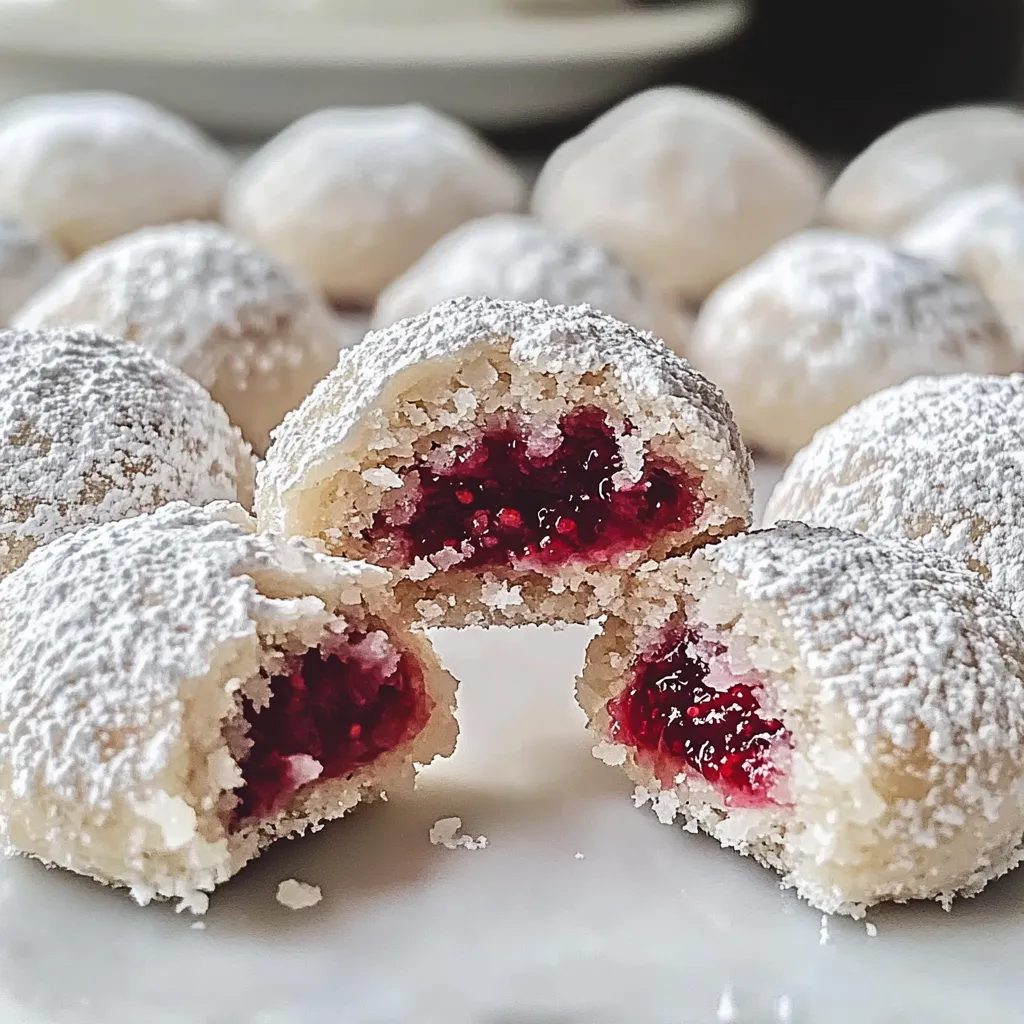 Raspberry almond snowballs cookies Easy baking tech for buttery cookies with a jam filled surprise Simple powdered sugar dusted treat